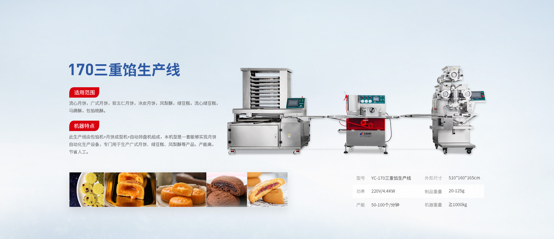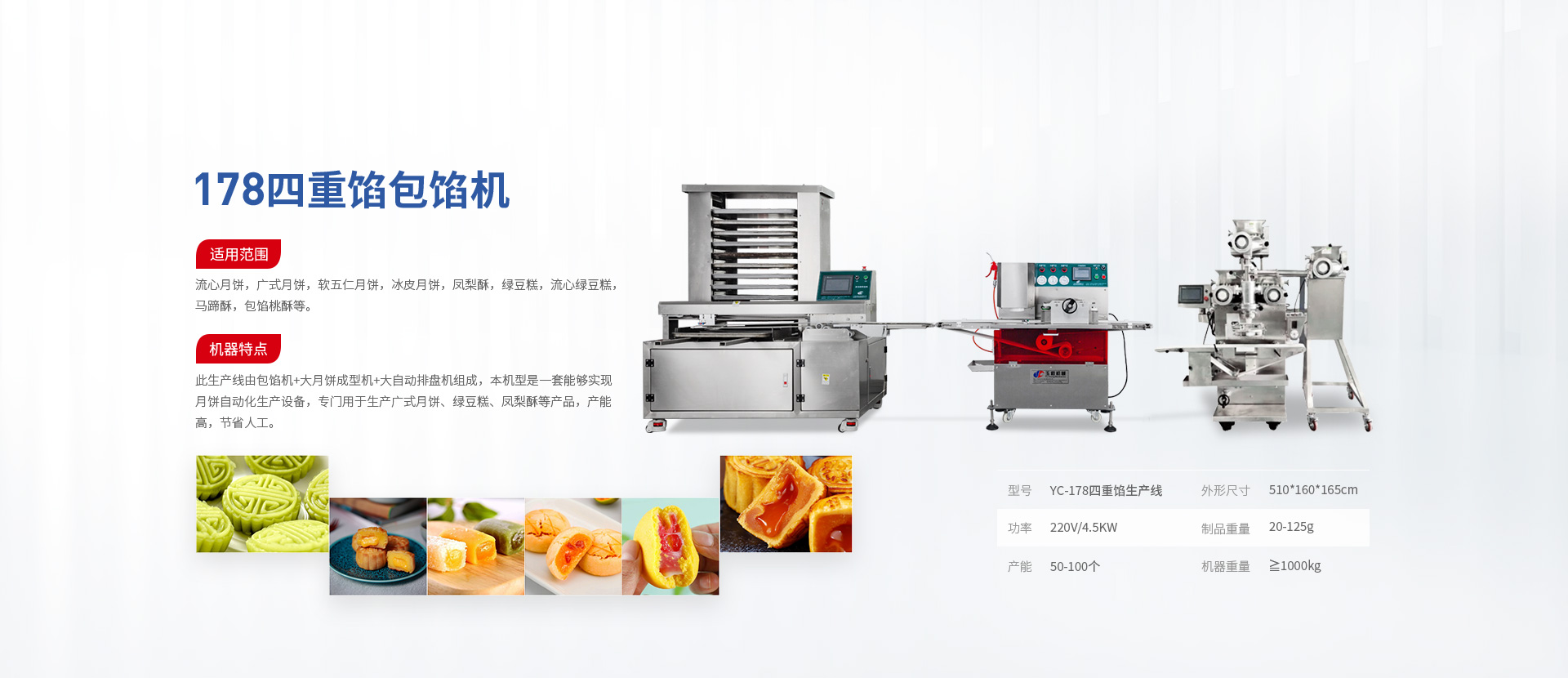 主營產(chǎn)品有:包餡機(jī)、全自動曲奇生產(chǎn)線、超聲波曲奇生產(chǎn)線、全自動酥餅開酥成型生產(chǎn)線、面包生產(chǎn)線、包子生產(chǎn)線、流心月餅生產(chǎn)線、蛋黃月餅生產(chǎn)線、麻薯青團(tuán)生產(chǎn)線、水果大福生產(chǎn)線、水餃生產(chǎn)線、魚丸生產(chǎn)線、水晶包生產(chǎn)線等各類食品機(jī)械。