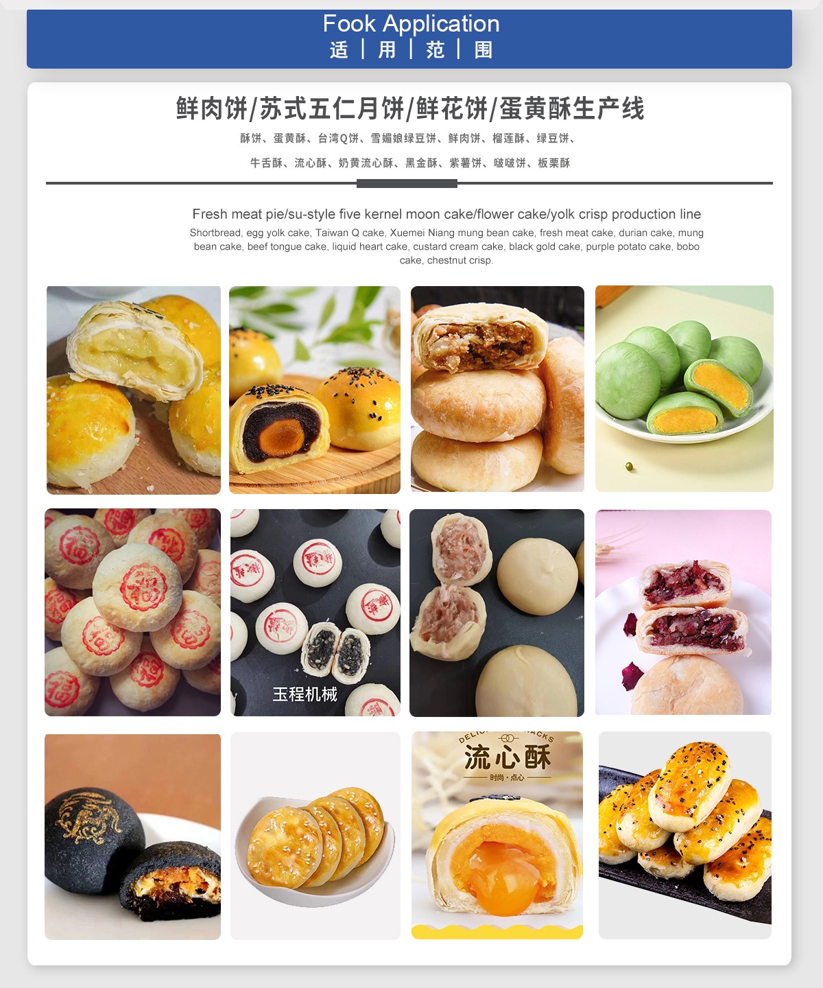 可適用于:酥餅、蛋黃酥、臺灣Q餅、雪媚娘綠豆餅、鮮肉餅、榴蓮酥、綠豆餅、牛舌酥、流心酥、奶黃流心酥、黑金酥、紫薯餅、啵啵餅、板栗酥